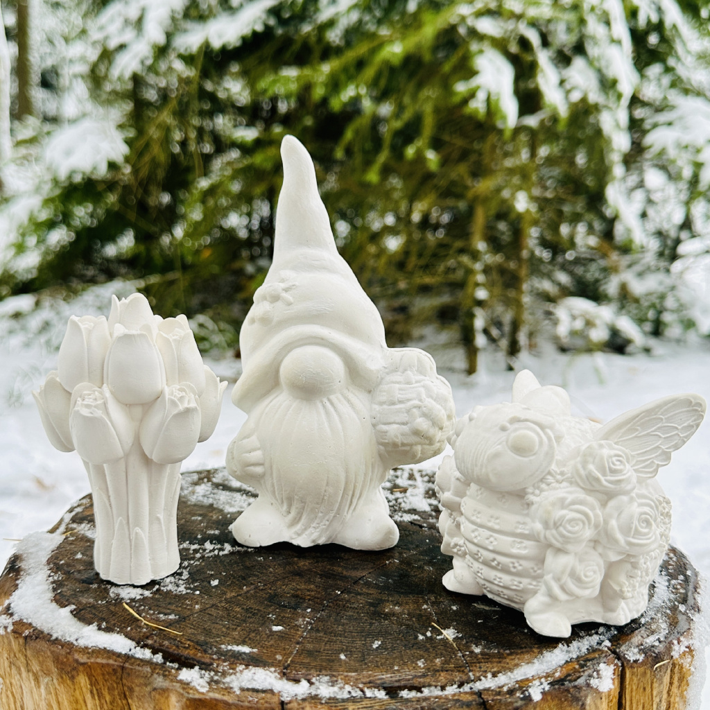 Abyste si mohli tyto výrobky vymalovat dle vlastní fantazie, nezapomeňte do košíku přihodit barvy. Při použití akrylového laku budou navíc barvy odolné vůči dešti. Můžete tedy skřítka s čistým svědomím nechat venku.